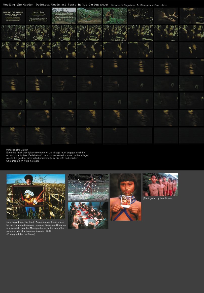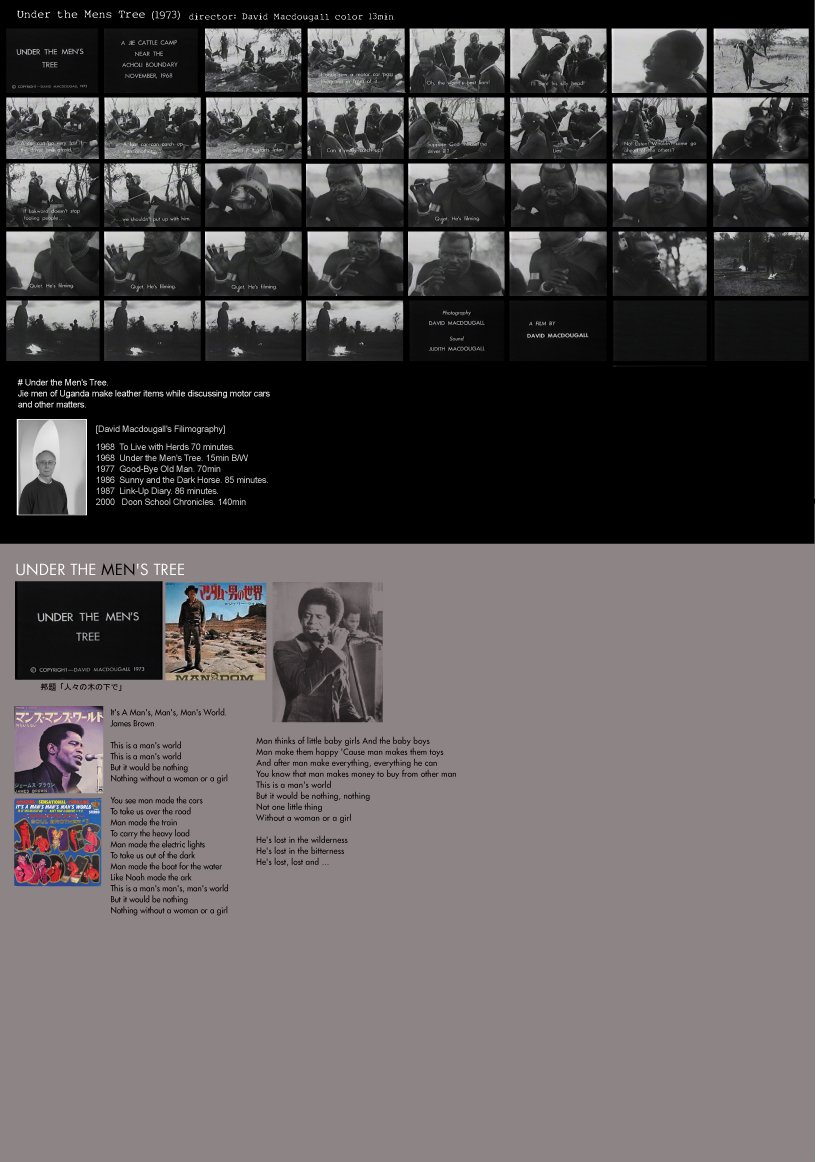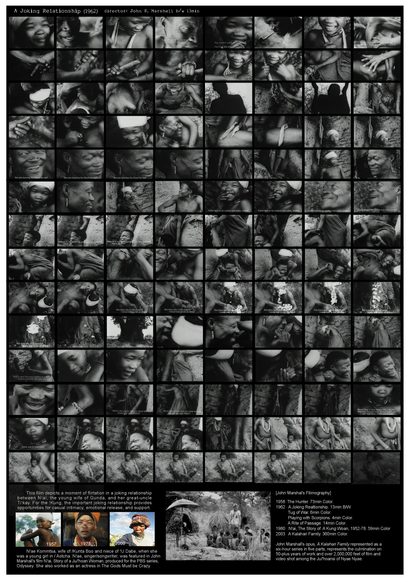 ![]() 今回は民族誌ドキュメンタリー映画の 傑作短編フィルムをノーカットで 一挙に四本上映します。 テレビ番組とのちがいに気をつけて、 みてみましょう。 ![]() プログラムは次のとおりです。 ▼ジョン・マーシャル 「冗談関係」 (1962年 13分 モノクロ) ▼ナポレオン・A・シャノン 「デデヘーワ父さん、家事をする」 (1974年 13分 カラー) ▼ナポレオン・A・シャノン 「デデヘーワ父さん、庭掃除をする」. (1974年 13分 カラー) ▼デヴィッド・マクドゥガル 「人々の木の下で」.. (1973年 13分 モノクロ) #タイトルをクリックすると 大きな画像と解説を みることができます。 アフリカのカラハリ砂漠に暮らす サン族( ブラジルのアマゾンに暮らす ヤノマモ(ヤノマミ)族、 それに、ウガンダの カラモジョ族の普段の 生活や暮らしを 「リアル」に描いた 文化人類学的にみて 「ただしい」ドキュメント 映画である、と同時に、 映像作品としても、 すぐれた作品です。 ................................................. [参考]▼「イン・メモリー」 「冗談関係」を撮ったジョン・マーシャルの カラハリでの葬儀などを記録したドキュメント ▼ジョン・マーシャル「カラハリ・ファミリー」(予告編) ▼ナポレオン・A・シャノン「饗宴」 時間がゆるせば、傑作実験映画として次の作品も見たいと思います。 ![]() ▼ゾラ・ニール・ハーストン 「フィールドワーク」 (4分30秒 モノクロ 1928年) ▼マヤ・デーレン 「神の馬なる者たち」(52分 モノクロ 1941年) ▼ペーター・クーベルカ 「われらがアフリカ旅行」(12分 カラー 1966年) ▼トリン・T・ミンハ 「ルアッサンブラージュ」(40分 カラー 1982年) #サウンド・トラックによるレジュメを聴く→Re/reassemblagez ▼マヤ・デーレン 「神の馬なる者たち」 ▼ペーター・クーベルカ 「われらがアフリカ旅行」 ▼トリン・T・ミンハ 「ルアッサンブラージュ」 さらに、もし時間がゆるせば、次の作品も見たいと思います。 ![]() ▼ジェリー・リーチ 「トロブリアンド・クリケット」(53分 カラー 1979年) ▼クリス・マルケル 「サン・ソレイユ」(100分 カラー 1989年) ▼シャロン・ロックハート 「テアトロ・アマゾナス」(35分 カラー 1999年) ▼ヴェルナー・ヘルツオーク 「緑のアリが夢見るところ」 (100分 カラー 1984年) ▼ジェリー・リーチ 「トロブリアンド・クリケット」 ▼クリス・マルケル 「サン・ソレイユ」 ▼ヴェルナー・ヘルツオーク 「緑のアリが夢見るところ」 #